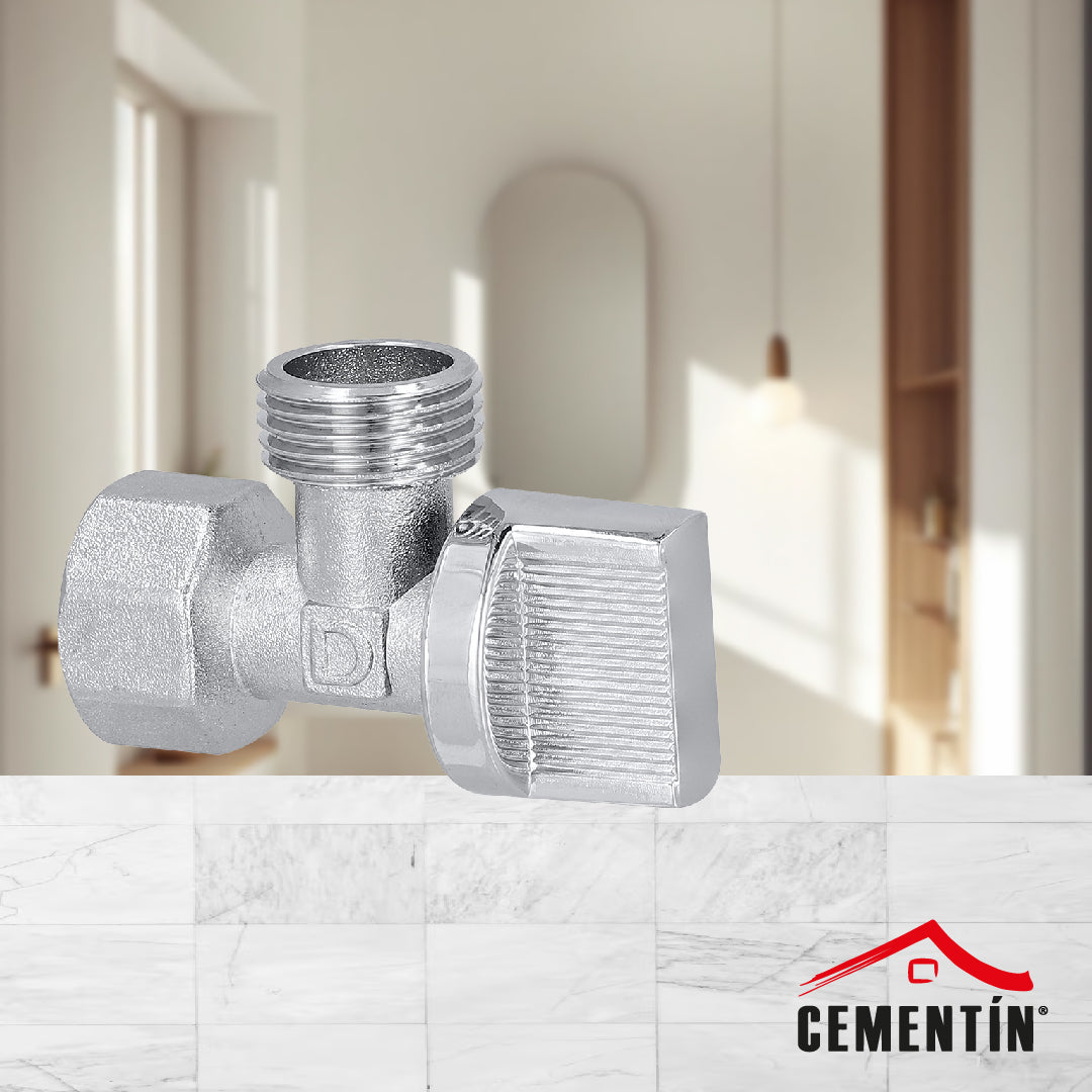 Llave angular con instalación roscable y cartucho ABS de alta durabilidad. Su acabado cromado ofrece resistencia y estética superior. Con 5,6 cm de largo, proporciona el espacio necesario para una instalación eficiente en espacios reducidos.