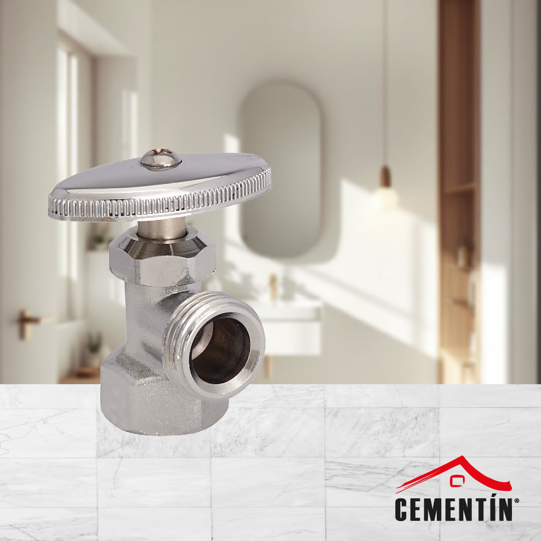 Llave de control angular fabricada en latón con instalación roscable. Diseñada con rosca a manguera de 1/2" NPS y rosca a red 1/2" NPT, garantizando conexiones seguras y herméticas en sistemas hidráulicos.