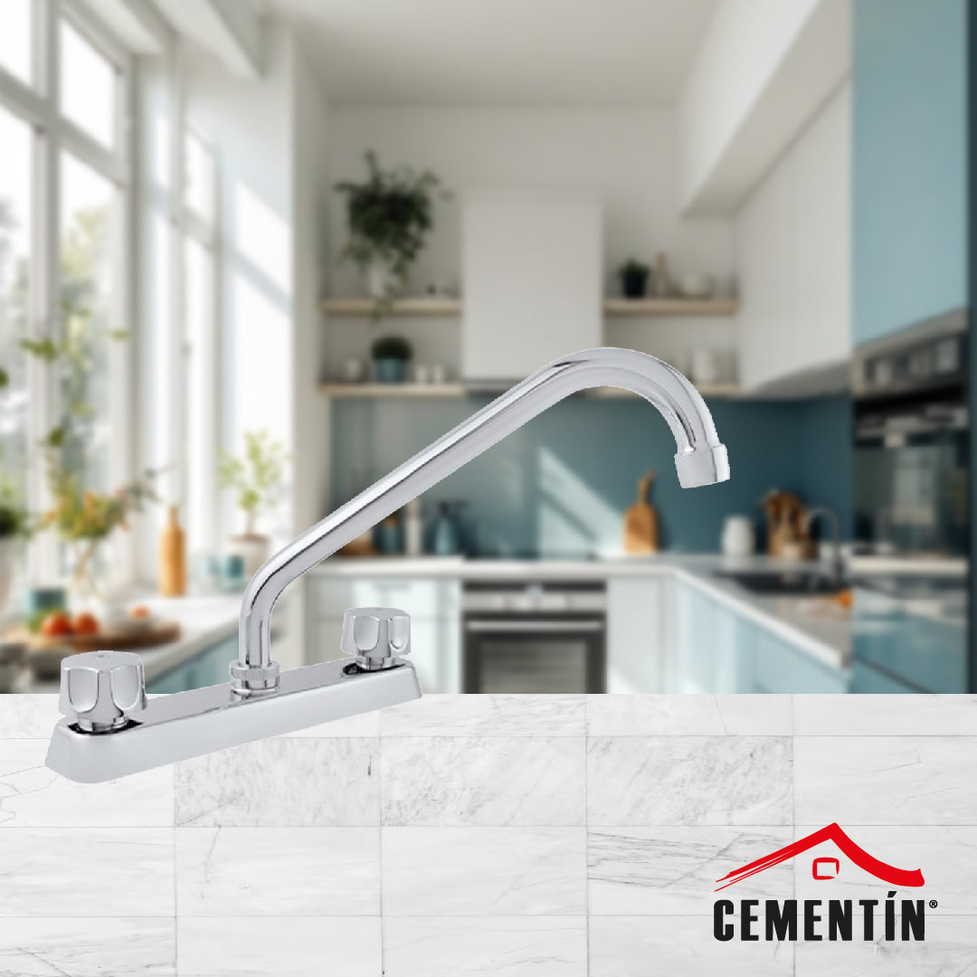 Mezcladora de plástico que incluye cubierta y manerales. Diseñada con cartucho cerámico de 1/4 de vuelta que garantiza un funcionamiento óptimo y ecológico a baja presión. Sus dimensiones de 25,6 cm de largo y 22 cm de altura total aseguran una instalación adecuada en diversos tipos de fregaderos.