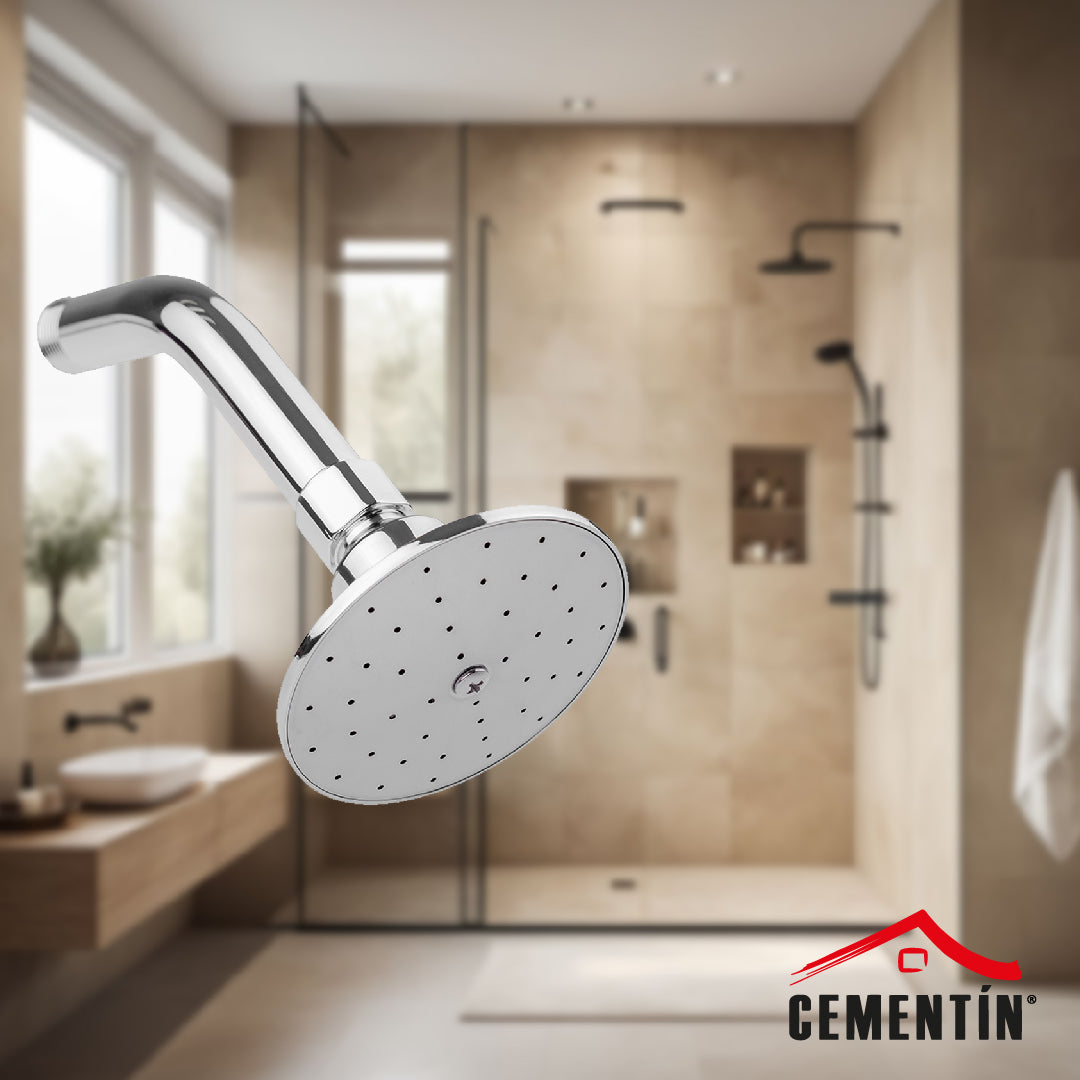 Regadera diseñada para funcionar de forma óptima con baja presión de agua. El cabezal de ducha redondo mide 8,6 cm de diámetro y el conjunto alcanza una longitud total de 22 cm. Incluye brazo y chapetón e incorpora un brazo resistente de acero inoxidable.